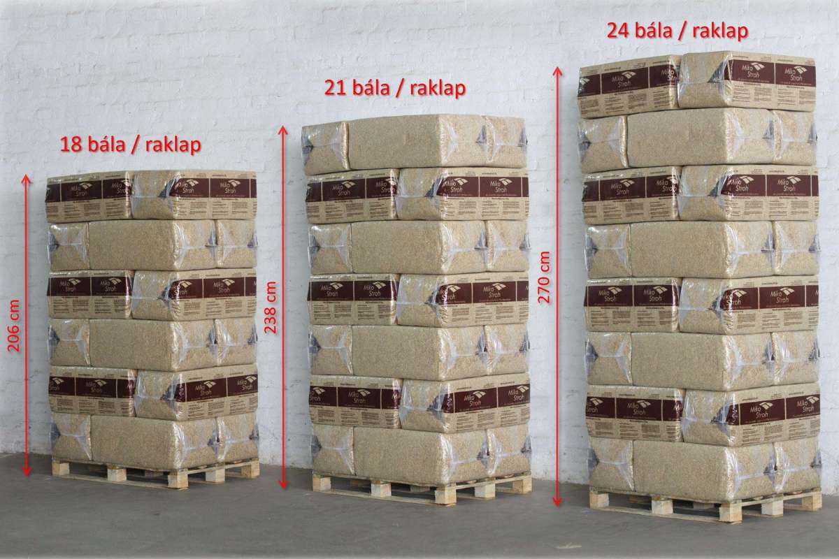 Egy raklapon (méret: 800x1200 mm) 18 db, 21 db vagy 24 db Mikó Stroh bálát pakolunk. A megrakott raklapok így 206 cm, 238 cm vagy 270 cm magasak lehetnek. A megrakott raklapokat körbefóliázzuk, és még egy további védőfóliával is ellátjuk.