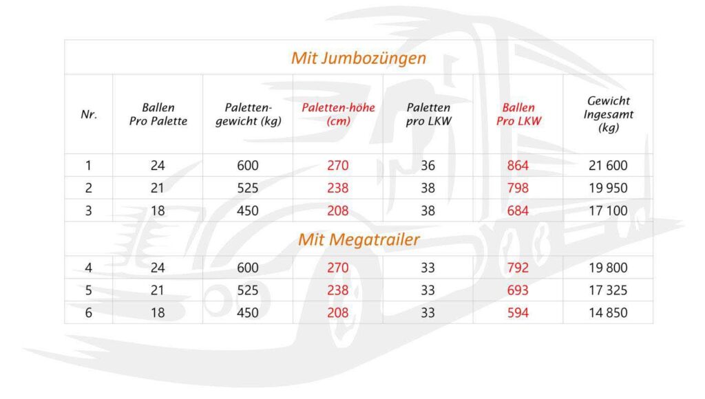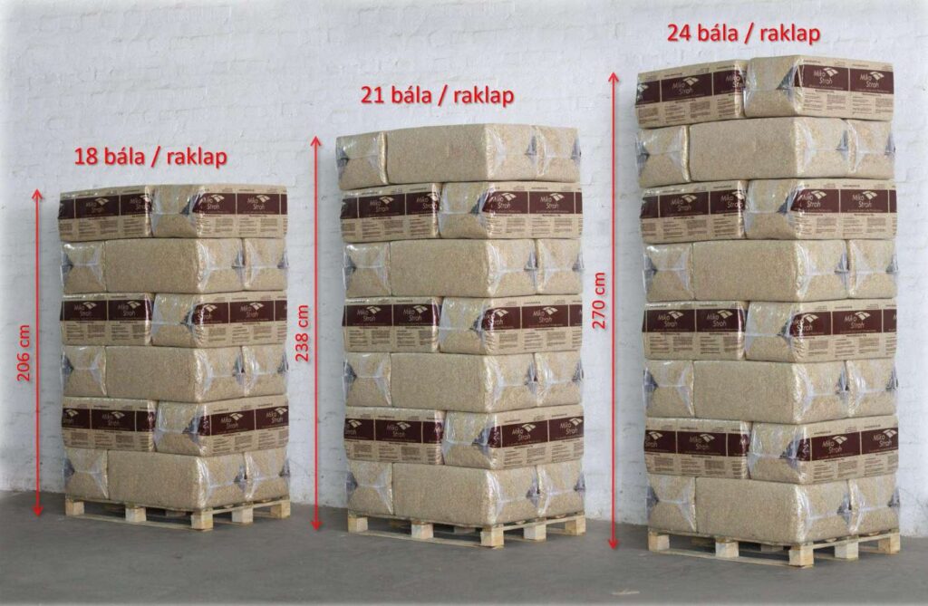 Egy raklapon (Egyutas raklap mérete: 800×1200×150 mm) 18, 21 vagy 24 Mikó Szalma bálát szállítunk. A raklapok magassága így 206 cm, 238 cm illetve 270 cm. A raklapok fóliázva vannak és egy extra takarófóliával vannak védve.